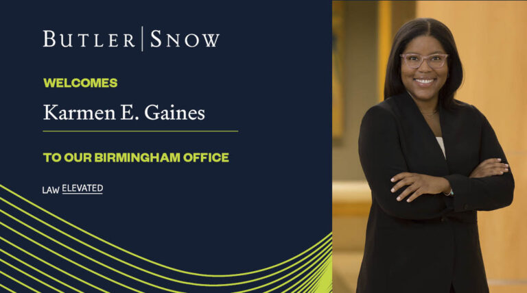 Butler Snow LLP is pleased to welcome attorney Karmen E. Gaines to the firm’s Birmingham, Alabama, office. Gaines joins as a member of Butler Snow’s Commercial Litigation practice group.