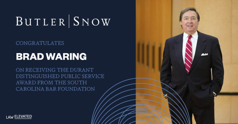 Butler Snow attorney Bradish “Brad” J. Waring has been selected to receive the DuRant Distinguished Public Service Award from the South Carolina Bar Foundation. Awarded in memory of Charlton DuRant, a well-known senator and special associate justice of the South Carolina Supreme Court, the DuRant award is one of the highest honors bestowed upon an attorney by the South Carolina Bar. Recipients are nominated and selected by their peers based on their service to the law and in their community. The award is bestowed annually at the South Carolina Bar Convention to be held in January 2026.