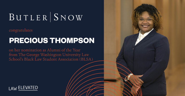 Butler Snow attorney Precious D. Thompson was nominated for The Jeanette A. Michael Alumnus of the Year Award, an honor presented by The George Washington University Law School Black Law Student Association (BLSA). The award recognizes an alum who has made outstanding contributions to the law school community and the Black community at large.